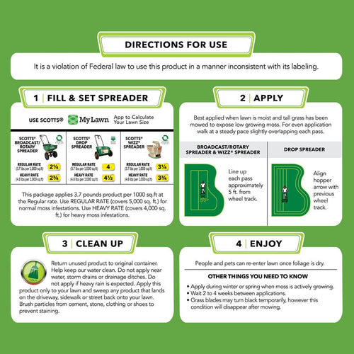 Scotts® MossEx™ controls moss without harming your lawn. After you apply MossEx™ it will attack undesirable moss, causing it to turn black and disappear. It also contains nutrients to green your lawn and develop thick grass. Apply Scotts® MossEx™ in the winter or spring when moss is actively growing. It is best applied when the lawn is moist and tall grass has been mowed to expose low growing moss. We recommend using a Scotts® spreader to apply this product. For Scotts® rotary/broadcast spreaders, use a setting of 2 ¼ for the regular rate or 2 ¾ for the heavy rate. For Scotts® drop spreaders, use a setting of 4 for the regular rate or 4 ½ for the heavy rate. For Scotts® Wizz®, use a setting of 3 ¼ for the regular rate and 3 ¾ for the heavy rate. If additional treatments are needed, wait 2 to 4 weeks between applications. Please note, grass blades may turn black temporarily; however, this condition will disappear after mowing.
